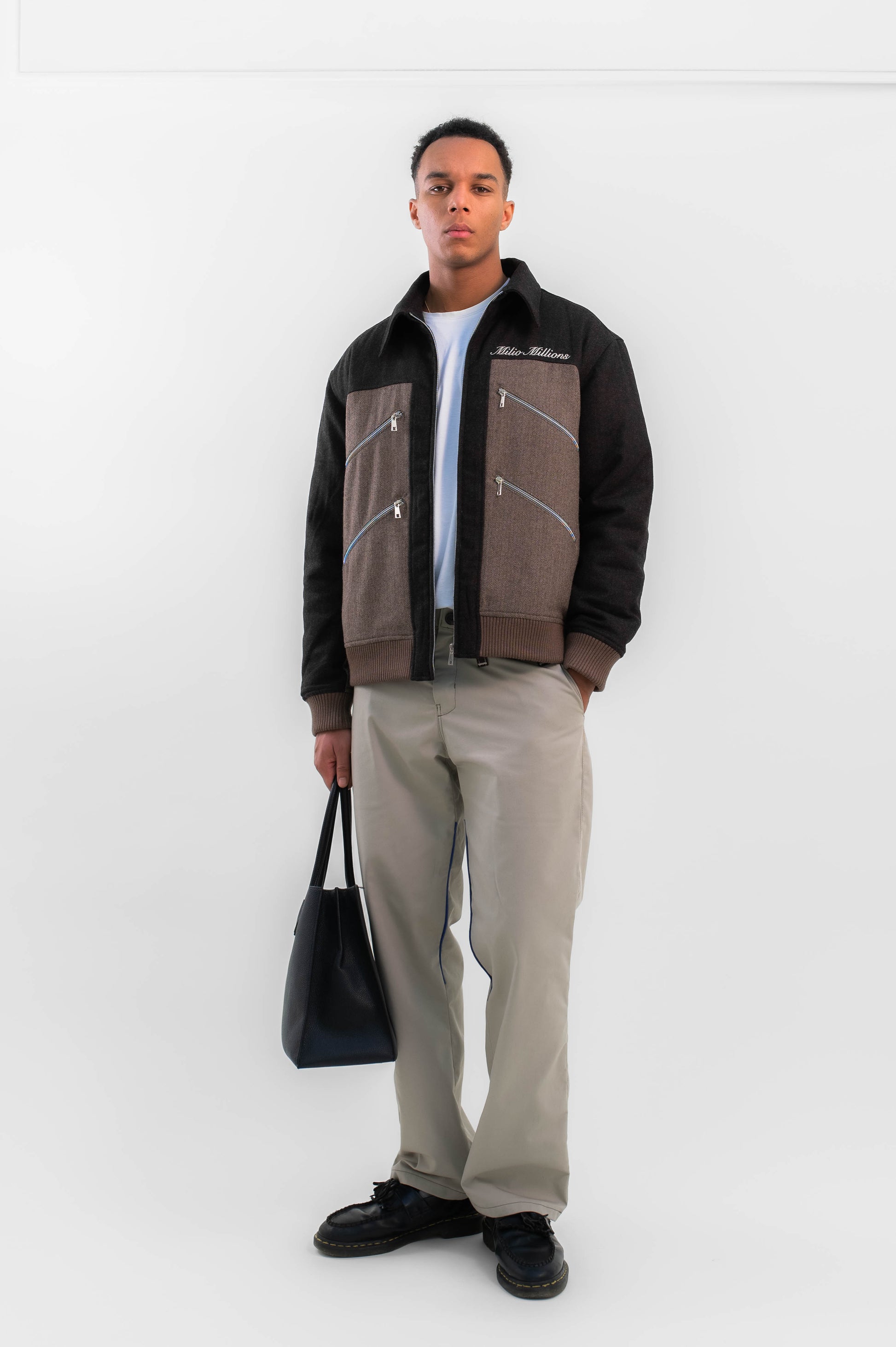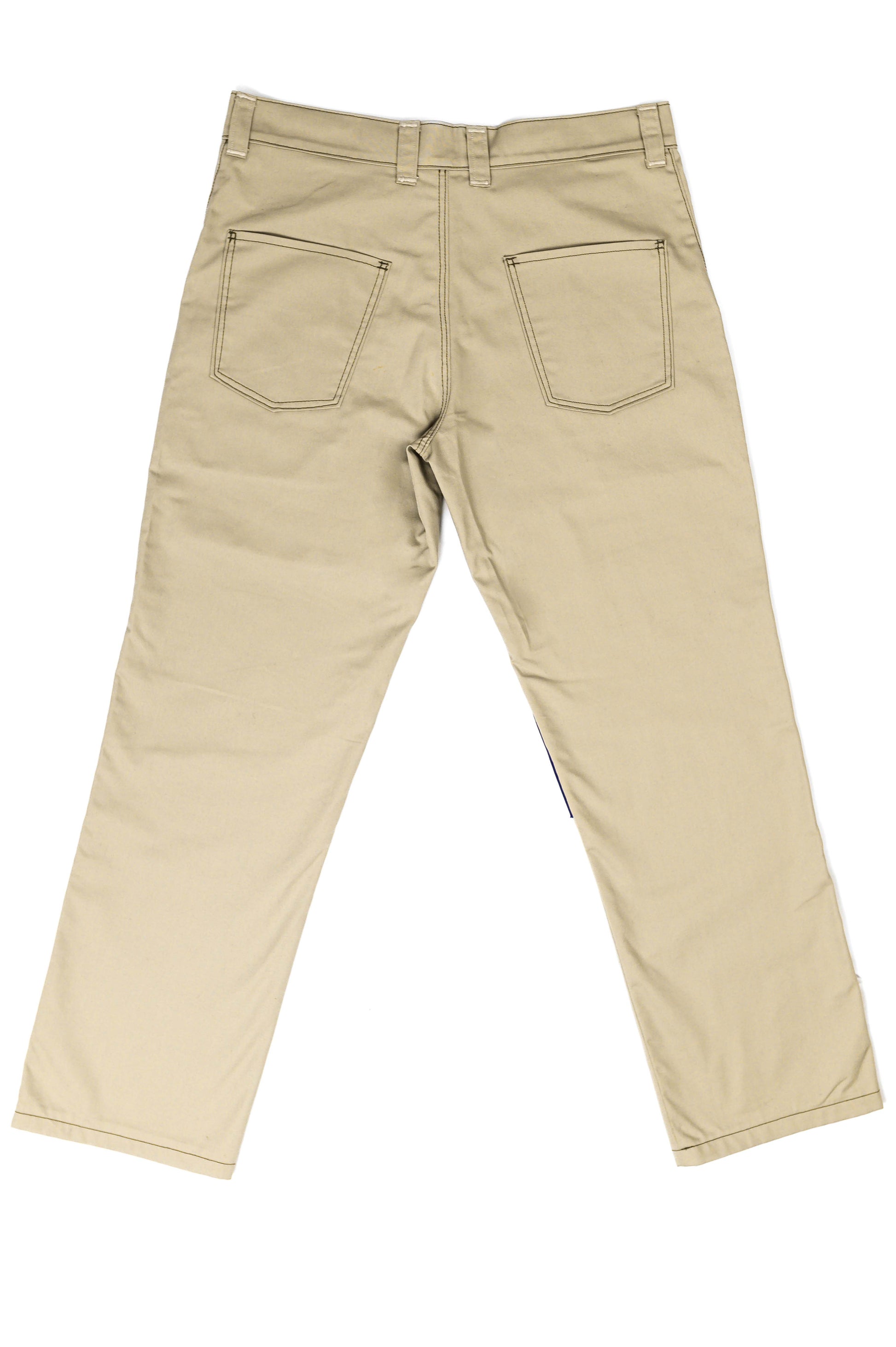 This is the brown M trousers. The subtly crafted details speak volumes. The brown M at the top of the trousers exudes class and individuality. The thin blue bands on the inside of the trousers are so subtle that they spark curiosity. They literally and figuratively add a pop of color to the design. The trousers have a straight, flattering fit and feel incredibly comfortable to wear.