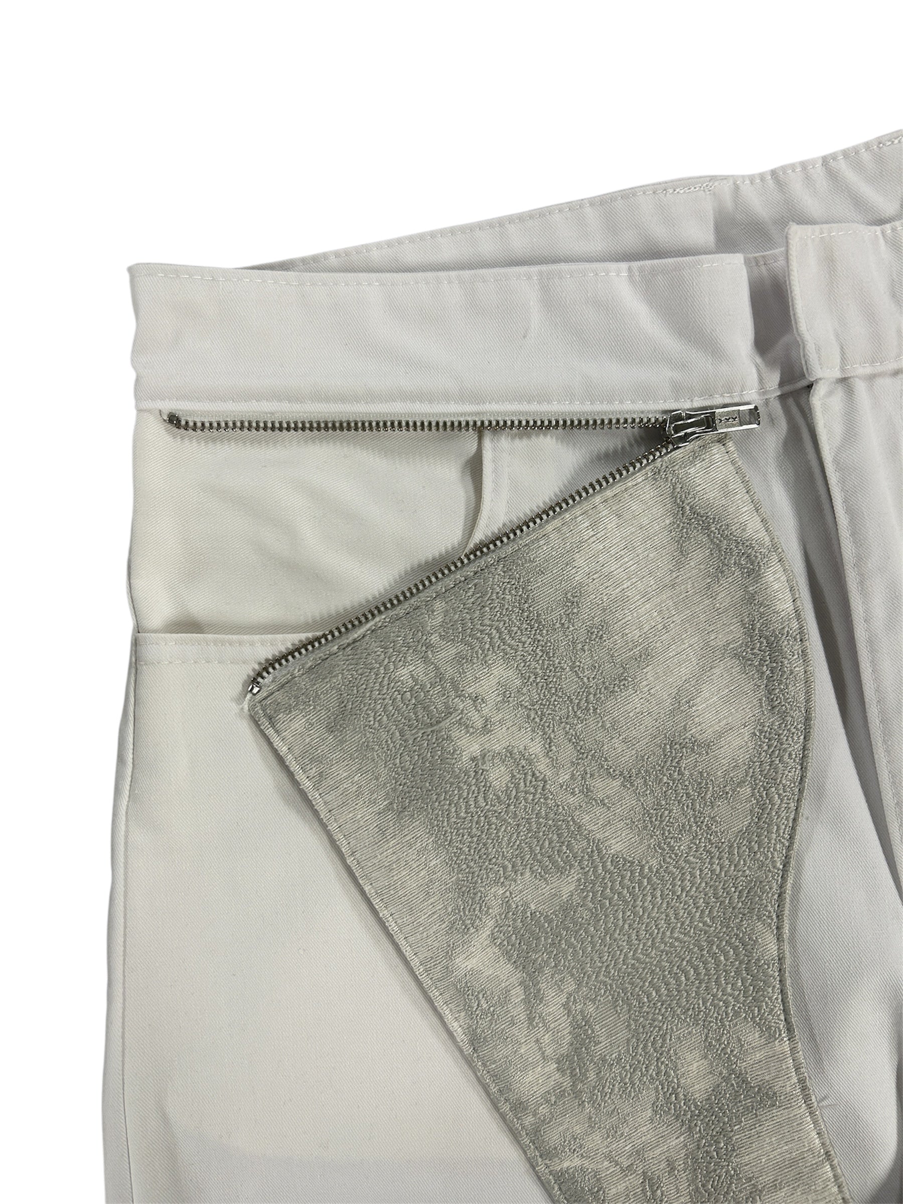 Handmade custom piece. “1/1” oversized-fit white jeans, 100% cotton. Featuring premium curtain fabric along the edge of the back pocket, extending to the front with a zipper and snap buttons.